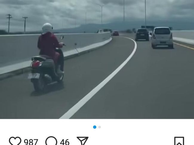 Dengan mengenakan helm, pemotor tersebut santai melintas. Padahal di badan jalan tol mobil-mobil melaju searah dengan kecepatan lebih tinggi.