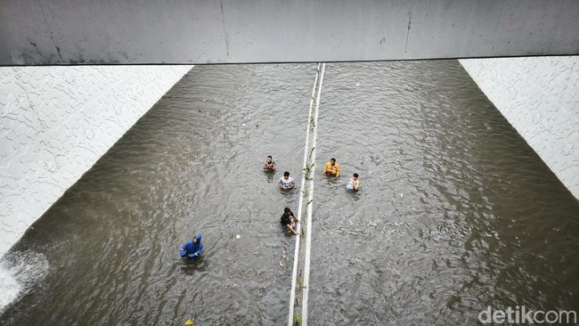 Pantauan detikJateng sore ini, nampak Underpass Joglo masih tergenang air banjir. Sejumlah warga bahkan memanfaatkan genangan di Underpass Joglo.