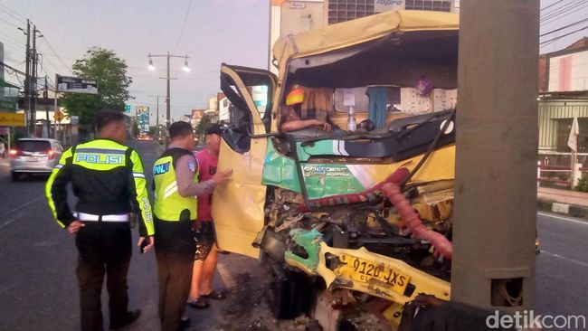 Truk boks nomor polisi B 9120 JXS menabrak tiang lampu penerangan jalan di Jalan Jogja-Solo, Desa Gatak, Kecamatan Delanggu, Klaten, pagi ini. Sopir truk terjepit kabin yang ringsek.