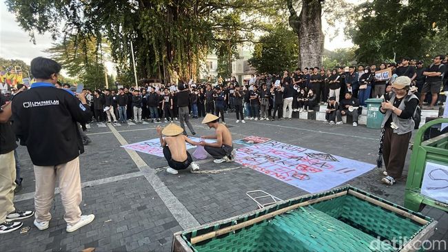 Sementara itu, di Jalan Jenderal Sudirman (Jensud) mahasiswa menggelar aksi teatrikal dengan menutup jalan. Alhasil, kendaraan yang dari arah Gladak menuju timur sempat terhenti dan mendapat klakson dari pengendara. Pihak kepolisian pun membantu membuka akses agar kendaraan melaju dari barat bisa melintas.