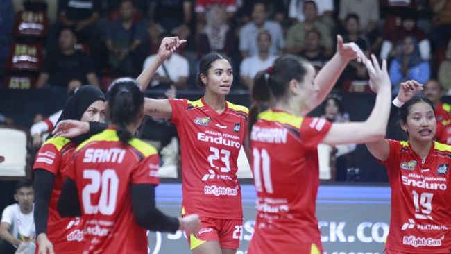 Laga Jakarta Pertamina Enduro melawan Gresik Petrokimia Pupuk Indonesia, pada final four pekan ketiga Proliga 2025 digelar di GOR Sritex Arena Solo, Jumat (2/5/2025). Laga berjalan sengit, namun Gresik Petrokimia Pupuk Indonesia terkena comeback Jakarta Pertamina Enduro.