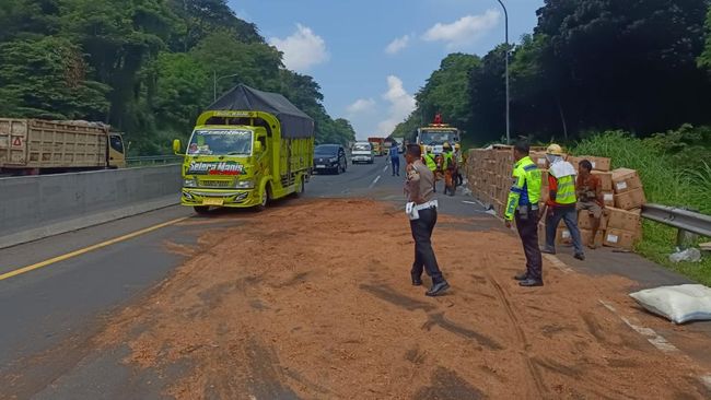 Akibatnya, truk Hino terguling dan melintang, menutup dua lajur tol. Petugas patroli jalan raya segera mendatangi lokasi untuk melakukan evakuasi dan mengatur arus lalu lintas.