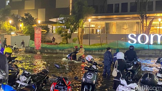 Tampak beberapa motor mogok lantaran air yang menggenang cukup tinggi. Beberapa motor juga memilih menepi di sekitar minimarket dan Queen City. Genangan tertinggi tampak berada di belakang Queen City.