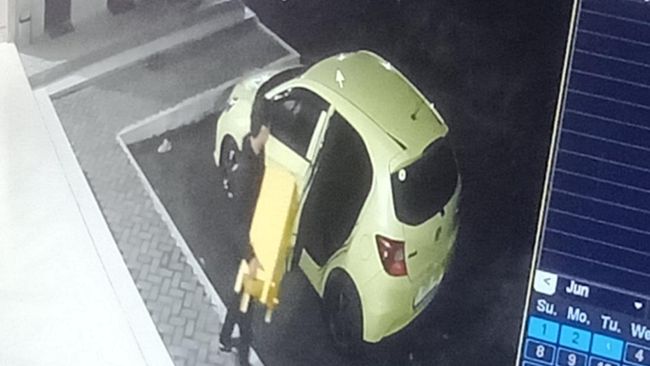 Pelaku membuka pintu belakang samping kiri mobilnya. Pria tersebut kemudian masuk masjid, keluar menggotong kotak infak besi cukup besar dan dimasukkan ke jok belakang lalu pergi.