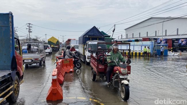 Pantauan detikJateng, Jumat (13/6/2025), genangan air rob masih menggenangi Jalan Pantura Semarang-Demak. Tampak genangan rob di lajur sisi utara lebih tinggi dibandingkan di sisi selatan.