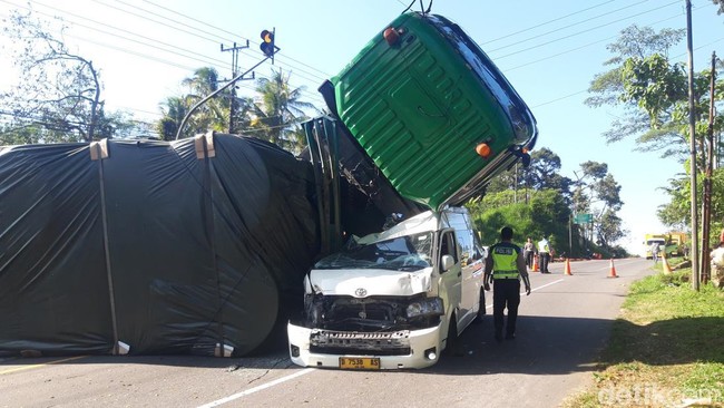 Bagian kepala truk trailer menimpa bagian tengah hingga depan samping kanan minibus. Mobil travel itu pun ringsek di bagian tengah samping kanan.