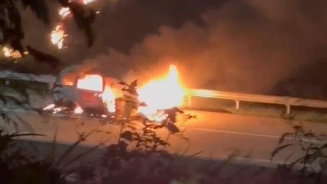 Dalam video yang beredar di grup WhatsApp, tampak sebuah mobil terbakar di tepi jalan tol. Api melalap keseluruhan bodi mobil berwarna hitam tersebut.
