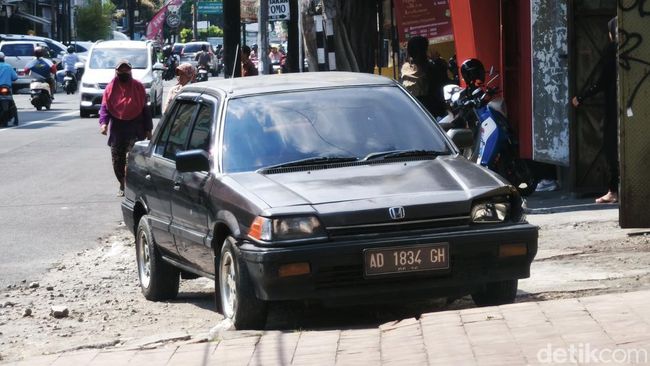 Nampak mobil sedan tua itu mengalami kerusakan pada bagian lampu kiri. Pengemudi lalu diminta bertanggung jawab atas perbuatannya.