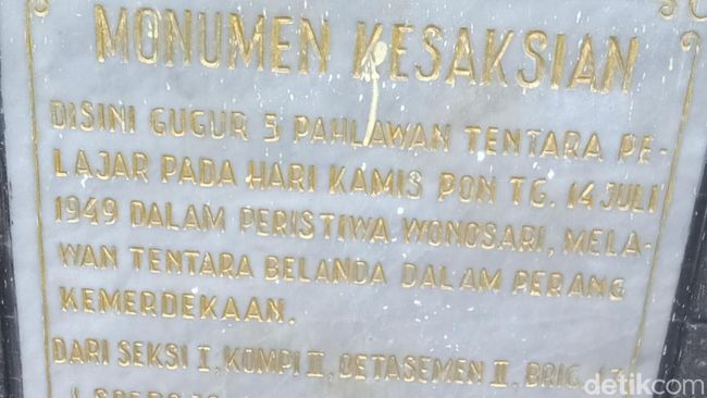 "Tanda Terimakasih Atas Nama Rakyat Desa Pandanan Dan Desa Bentangan Kec. Wonosari Kab Klaten, Bangga dan Yakin Kepada Tentara Pelajar Detasemen Ii Brig 17 Umumnya Khususnya Kelompok -Regu Sebagai Pelaku2 Peristiwa Wonosari Kamis Pon I4 Juli 1949 Yang Telah Mendirikan Tonggak/ Monumen Kenangan Pahlawan Pelajar Pejoang Yang Telah Gugur Dalam Peristiwa Wonosari Sebagai Pandu Proklamasi 4945 Wonosari.." demikian tulisan pada prasasti tersebut seperti dikutip detikJateng, Minggu (20/7/2025).