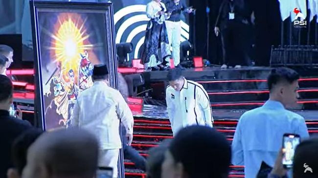 Momen itu terjadi dalam penutupan Kongres PSI yang dihelat di Edutorium UMS, Minggu (20/7/2025). Prabowo dan Kaesang awalnya berjalan ke tengah panggung, menuju lukisan yang ditutup bendera PSI bergambar gajah berkepala merah.