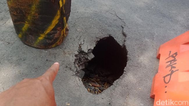 Di bawah lubang jalan tampak ruangan seperti saluran air. Untuk mengamankan lokasi, dipasang tong bekas dan water barrier sebagai penutup.