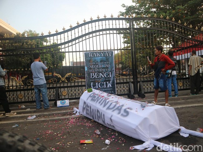 Terlihat dari luar terdapat keranda mayat ditaruh massa di depan Kantor Bupati Pati. Selain itu juga ada truk tronton yang terparkir di depan Kantor Bupati.