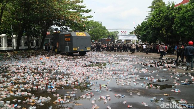 Saat ini terlihat botol air mineral menumpuk di halaman Kantor Bupati Pati imbas lemparan massa yang mendesak Bupati Pati Sudewo Mundur. Beberapa kaca di kompleks Kantor Bupati Pati juga pecah.
