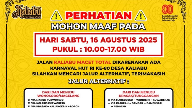 Desa Kaliabu, Kecamatan Salaman, Kabupaten Magelang, bakal mengadakan karnaval HUT ke-80 Kemerdekaan RI besok. Warga pun diimbau melewati jalur lainnya.