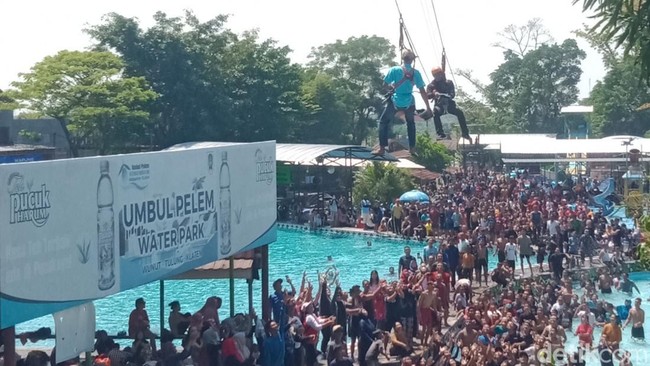 Warga dari berbagai daerah dan usia pun berkerumun di area kolam dan wahana permainan air mulai pukul 10.00 WIB. Begitu panitia meluncur dari flying fox dengan menyebar uang, para pengunjung riuh menangkap.