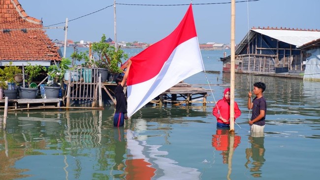 Puncaknya pada Minggu (17/8), warga menggelar upacara kemerdekaan di atas gladak kayu dan tanah kampung yang sudah terendam air laut. Meski sederhana, prosesi upacara tetap berlangsung khidmat.