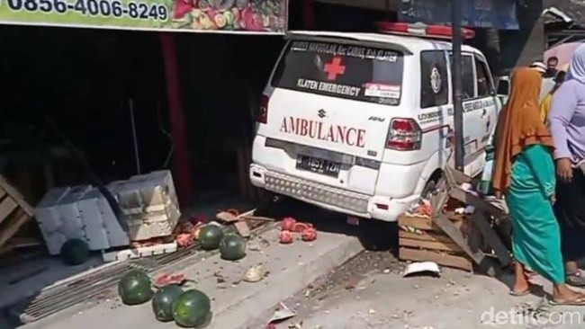 Kanit Gakkum Sat Lantas Polres Klaten Iptu Alif Akbar Lukman Hakim menjelaskan ambulans menabrak lapak, ruko dan sepeda motor. Dua orang luka lecet.