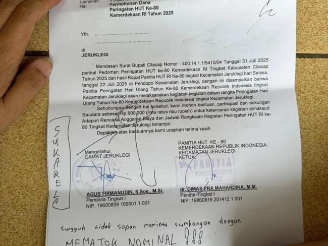 Camat Jeruklegi, Kabupaten Cilacap, memberikan klarifikasi sekaligus meminta maaf soal permintaan sumbangan kepada pelaku usaha untuk kegiatan upacara HUT ke-80 Republik Indonesia di wilayahnya yang jadi sorotan hingga viral di media sosial.