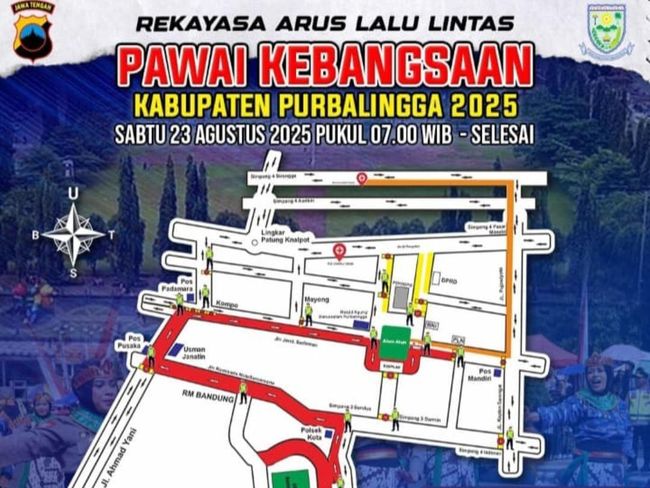 Pemkab Purbalingga akan menggelar pawai kebangsaan dalam rangka HUT ke-80 Republik Indonesia, Sabtu (23/8/2025) pagi. Pawai tersebut akan melewati jalan protokol, dampaknya sejumlah ruas jalan akan diberlakukan rekayasa arus lalu lintas.