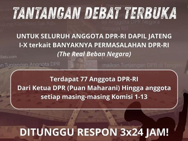 Poster tersebut diunggah akun Instagram resmi @bemkmunissula. Poster undangan itu bertulisan bahwa mahasiswa menantang anggota DPR RI daerah pemilihan (dapil) Jawa Tengah (Jateng) untuk debat terbuka.