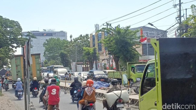 Pantauan detikJateng di Jalan Majapahit, Kecamatan Pedurungan, Kota Semarang, tampak proyek perbaikan jalan yang dilakukan sempat membuat arus lalu lintas di jalur sisi utara terhambat.