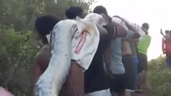 Setelah memastikan ular tidak bergerak, bangkainya dibawa ke perkampungan. Hal itu menjadi tontonan warga sebelum akhirnya dijual.