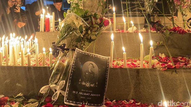 Pantauan detikJateng, aksi digelar di halaman kampus FH Unnes, Kecamatan Gunungpati, Senin (2/9/2025) malam. Ratusan lilin dinyalakan menerangi pelataran kampus tersebut.