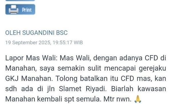 "Mas Wali, dengan adanya CFD di Manahan, saya semakin sulit mencapai gerejaku GKJ Manahan. Tolong batalkan itu CFD mas, kan sudah ada di jln Slamet Riyadi. Biarlah kawasan Manahan kembali seperti semula," tulis Sugandini seperti dikutip dalam Ulas, Minggu (20/9/2025).