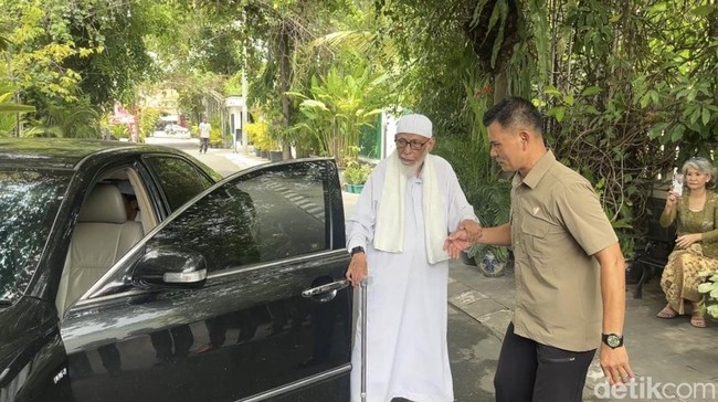 Dari pantauan detikJateng, Abu Bakar Baasyir tiba di rumah Jokowi sekira pukul 12.33 WIB. Abu Bakar Baasyir terlihat memakai tongkat untuk berjalan. Turun dari mobil, Baasyir dibantu Paspampres Jokowi berjalan.