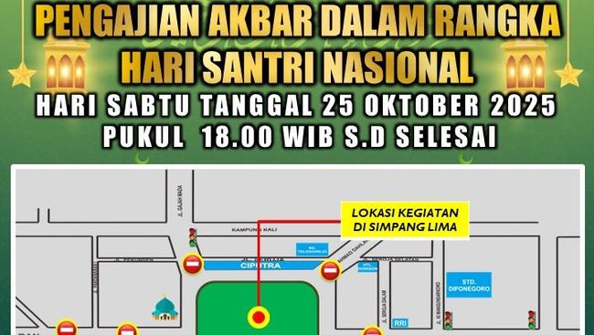 "Alih arus lalu lintas saat pengajian Hari Santri Nasional 2025 dilakukan hari ini pukul 18.00 WIB sampai dengan selesai," kata Ida saat dihubungi detikJateng, Sabtu (25/10/2025).