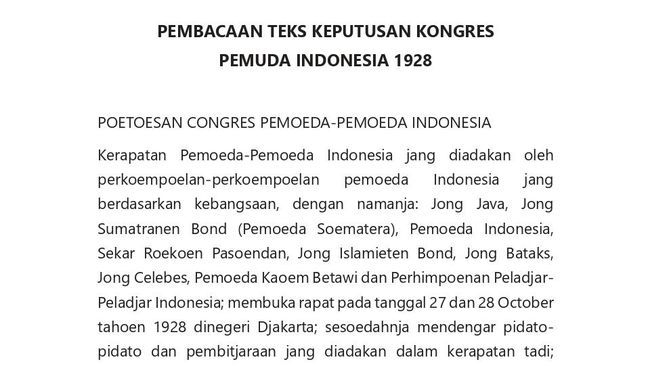 Kerapatan Pemoeda-Pemoeda Indonesia jang diadakan oleh perkoempoelan-perkoempoelan pemoeda Indonesia jang berdasarkan kebangsaan, dengan namanja: Jong Java, Jong Sumatranen Bond (Pemoeda Soematera), Pemoeda Indonesia, Sekar Roekoen Pasoendan, Jong Islamieten Bond, Jong Bataks, Jong Celebes, Pemoeda Kaoem Betawi dan Perhimpoenan Peladjar-Peladjar Indonesia; membuka rapat pada tanggal 27 dan 28 October tahoen 1928 dinegeri Djakarta; sesoedahnja mendengar pidato-pidato dan pembitjaraan jang diadakan dalam kerapatan tadi; sesoedahnja menimbang segala isi pidato-pidato dan pembitjaraan ini; kerapatan laloe mengambil poetoesan: