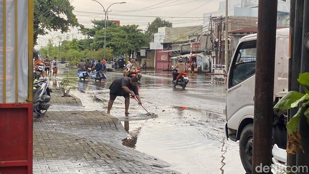 Pantauan detikJateng di Jalan Kaligawe, Kelurahan Tambakrejo, Kecamatan Gayamsari, Kota Semarang, pukul 16.30 WIB, tampak air di Jalan Kaligawe lajur barat ke timur mulai surut. Beberapa orang membersihkan pelatarannya yang kotor akibat banjir sepekan lebih.