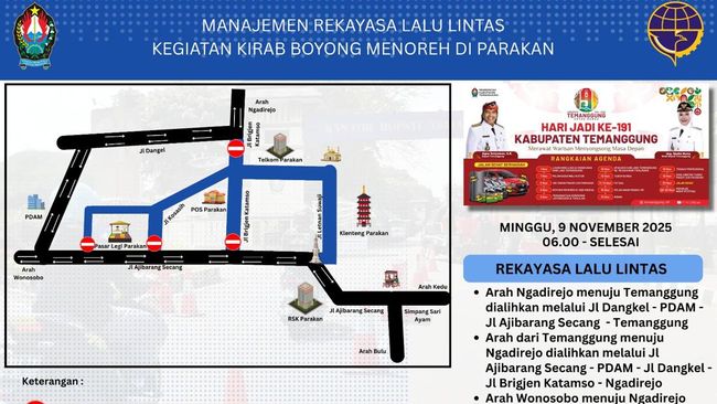 Pemkab Temanggung menggelar Kirab Boyong Menoreh di Parakan dalam rangka hari ulang tahun (HUT) yang ke-191, besok. Terkait hal tersebut, sejumlah jalan bakal ditutup. Berikut rekayasa lalu lintasnya.