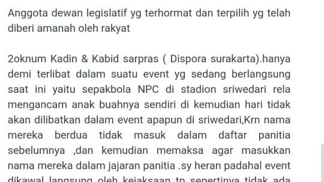 "Anggota dewan legislatif yg terhormat dan terpilih yg telah diberi amanah oleh rakyat 2oknum Kadin & Kabid sarpras ( Dispora surakarta).hanya demi terlibat dalam suatu event yg sedang berlangsung saat ini yaitu sepakbola NPC di stadion sriwedari rela mengancam anak buahnya sendiri di kemudian hari tidak akan dilibatkan dalam event apapun di sriwedari,Krn nama mereka berdua tidak masuk dalam daftar panitia sebelumnya ,dan kemudian memaksa agar masukkan nama mereka dalam jajaran panitia .sy heran padahal event dikawal langsung oleh kejaksaan tp sepertinya tidak ada nyali untuk menindak tegas oknum2 pejabat pencuri hak rakyat seperti mereka,mana janji kalian yg akan mensejahterakan rakyat..jika kondisi seperti ini saja kalian tidak membela rakyat..proses oknum TDK bermoral itu mutasi kalo perlu pecat penjarakan .saya yakin banyak event yg mereka mainkan di belakang .lakukan bentuk tim untuk investigasi lanjutan ..berikan bukti pada rakyat kalo kalian bekerja.ingat jabatan hanya sementara tapi akibat kejahatan akan dipertanggung jawabkan di dunia dan akherat..," tulisnya di ULAS, seperti yang dilihat detikJateng, Rabu (19/11/2025).