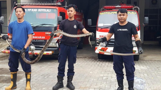 Petugas Pemadam Kebakaran (Damkar) Satpol PP Boyolali, berhasil mengevakuasi dua ular dari rumah warga. Ular itu berjenis piton sepanjang sekitar 2,5 meter yang masuk dapur dan ular sowo kopi atau soros yang ngumpet di tumpukan genteng.