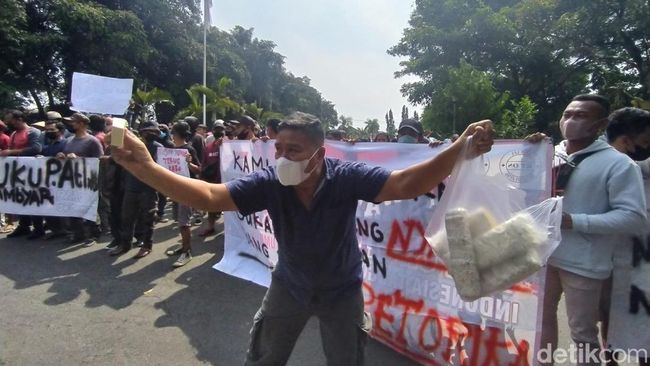 Berdasarkan pantauan detikJateng, ratusan massa itu datang mengendarai mobil dan truk. Mereka berangkat dari tempat usaha sentra tahu dan tempe di Mejing, Kecamatan Candimulyo.