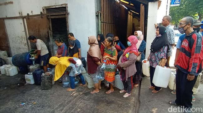 Pantauan detikJateng di lokasi pukul 10.30 WIB, warga antre di depan toko minyak goreng curah yang berada di Desa Mlati Lor, Kecamatan Kota. Tampak jeriken hingga galon air minum tertata, antre untuk mendapatkan minyak goreng curah.