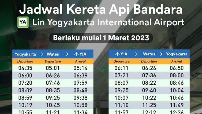 Rinciannya, untuk relasi dari Stasiun KA Jogja menuju Stasiun Bandara YIA dimulai dari pukul 04.35 WIB hingga pukul 19.00 WIB. Selanjutnya, untuk relasi Stasiun Bandara YIA menuju Stasiun KA Jogja mulai dari pukul 06.11 WIB hingga 21.25 WIB.