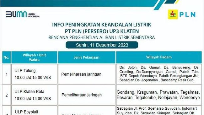 Dikutip detikJateng dari akun Instagram PLN Klaten @plnklaten, rencana penghentian aliran listrik sementara Senin, 11 Desember 2023 dilakukan di tiga unit layanan pelanggan (ULP). Yaitu ULP Tulung, Klaten Kota dan Boyolali.