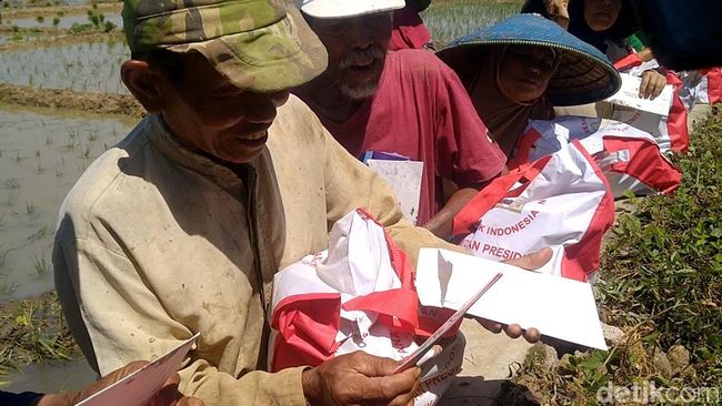 Sementara itu, dalam kunjungannya ke areal persawahan, Presiden Jokowi juga membagikan sembako dan amplop untuk para petani. Para petani pun senang mendapat hadiah dari Presiden.