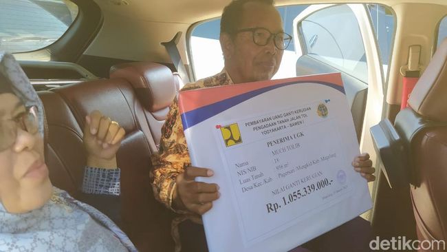 Warga dari 4 desa di Kabupaten Magelang hari ini menerima pembayaran uang ganti rugi (UGR) tol Jogja-Bawen. Salah satu penerima, Much Tolib (72) terpaksa menerima pembagian uang ganti rugi itu dari dalam mobil.