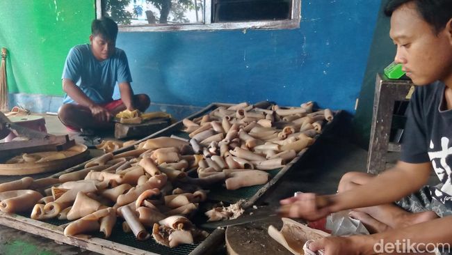 Pantauan detikJateng, di Desa Plosowangi, Bawak dan Planggu warga mulai ramai menerima pasokan kulit sapi. Setelah itu kulit sapi digodok, dikerok, dipotong dan dijemur sebelum digoreng.