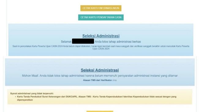 - Pelamar yang tidak dinyatakan lolos seleksi administrasi akan menerima notifikasi, "Mohon Maaf, Anda tidak lolos tahap administrasi karena belum memenuhi persyaratan administrasi instansi yang dilamar'.