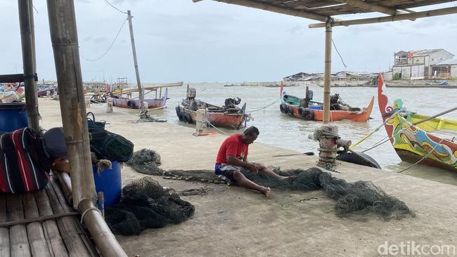 Pantauan detikJateng di pesisir Semarang, Kampung Nelayan Tambaklorok, Kecamatan Semarang Utara, tampak beberapa nelayan tengah menjahit jaring. Mereka sudah tak melaut selama tiga hari. Salah satunya warga Tambak Lorok, Sunarjo (61).