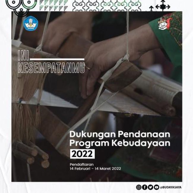 Dikutip dari fbk.id, bantuan pemerintah melalui program Fasilitasi Bidang Kebudayaan (FBK) kali ini mengusung tema Kearifan Lokal (Sandang, Pangan, Papan) untuk Kekinian Dan Masa Depan. Pendaftaran proposalnya dilaksanakan pada 14 Februari - 14 Maret 2022.