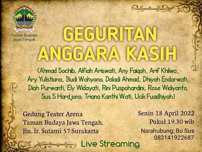 Bertempat di Teater Arena Taman Budaya Jawa Tengah (TBJT) di Jalan Ir Sutami No 57, Solo, akan digelar pembacaan puisi Jawa (geguritan) oleh 15 sastrawan Jawa Tengah.