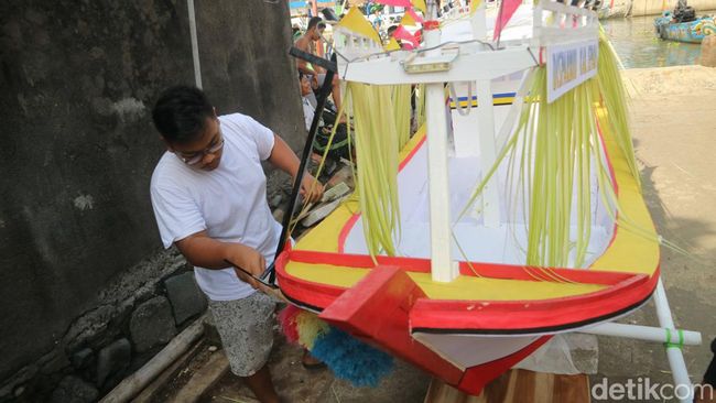 Pantauan di lokasi, Minggu (8/5) miniatur kapal sudah jadi. Pembuat kapal pun tengah membersihkannya untuk ditempatkan sesaji.