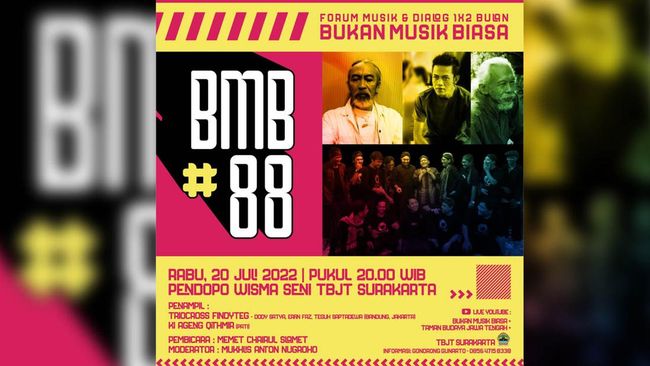 Kegiatan rutin Bukan Musik Biasa akan kembali digelar di Taman Budaya Jawa Tengah (TBJT) Solo malam ini, Rabu (20/7/2022). Adapun kegiatan ini akan digelar secara hybrid.