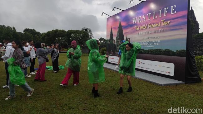 Gerimis tipis di Candi Prambanan sore ini tak menyurutkan antusiasme penonton yang datang di konser Westlife. Dengan mengenakan jas hujan plastik, mereka justru membuat suasana semakin berwarna. Nampak tua maupun muda tumpah ruah. Mereka ingin bernostalgia dengan lagu-lagu dari grup vokal asal Irlandia ini.