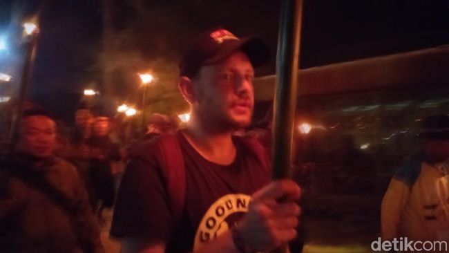 Bule ini juga tampak membawa obor dari pendopo pengayoman Samin Surosentiko dan berjalan menuju lapangan desa. Sampai dengan berjalan mengelilingi 1.907 obor sebanyak 3 kali. David bahkan sampai menenteng sepatu karena lapangan becek.